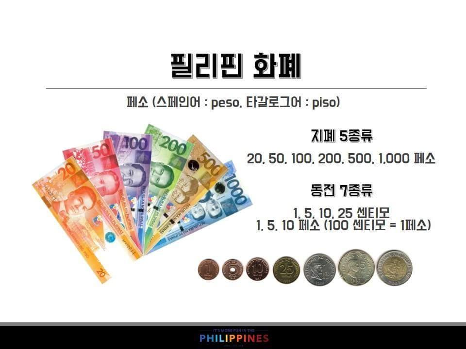한국에서 오실 때 원화나 페소보다 가급적 달러로 가져오시는 게 유리하시고요. 다만, 도착 첫날 현지에서 이용하실 소액은 현지 페소로도 가져 오셔도 되시며,